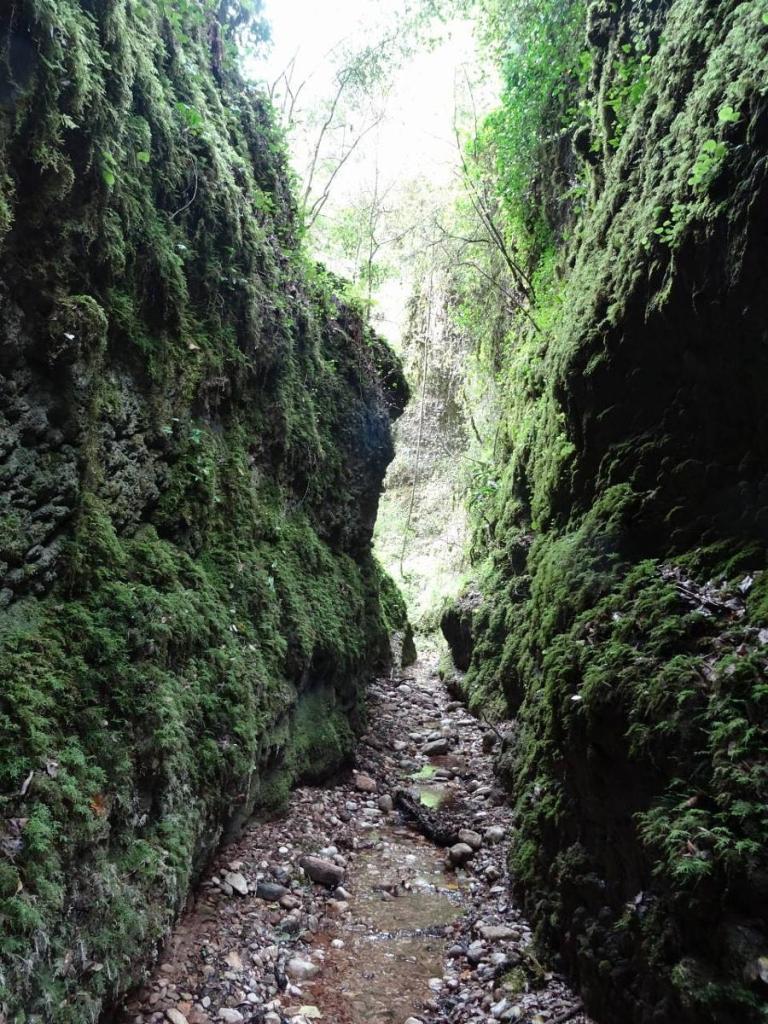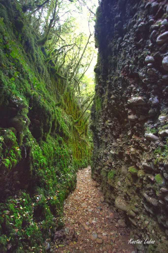 Μέχρι εδώ, ο πεζοπόρος ήδη βηματίζει γεμάτος ενθουσιασμό για την ομορφιά που περιβάλλει το μονοπάτι. Η συνέχεια όμως θα τον καθηλώσει. Οι φτέρες που σε οδηγούν μέχρι εκείνη τη στιγμή, αρχίζουν να αραιώνουν και αναλαμβάνει πλέον η ίδια η Γη να σε οδηγήσει στη μυστική και επιβλητική αρχιτεκτονική της. Το μονοπάτι αρχίζει να φαρδαίνει και συγχρόνως αρχίζει να ορθώνει δεξιά και αριστερά τα όριά του. Μία πλατιά ποταμίσια πέτρα ξαπλώνει στο έδαφος. Λίγο υγρό χώμα την σκεπάζει. Άλλες δύο πέτρες ξαπλώνουν δίπλα και πάνω από την πρώτη. Αυτή η ομοιόμορφη συνεργασία συνεχίζεται, αναγκάζοντας τα μάτια να ακολουθήσουν. Χωρίς να το καταλάβεις, βρίσκεσαι να περπατάς ανάμεσα σε δύο τοίχους ύψους 30 μέτρων.