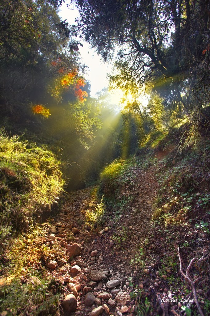 Αρχικά, συναντούμε ένα ελαφρώς κατηφορικό μονοπάτι περίπου 900 μέτρων. Είναι φαρδύ, πετρώδες και υπάρχει αρκετά μεγάλη ποικιλία στην βλάστηση, από φτέρες και βότανα μέχρι πουρνάρια και αριές. Οι φτέρες αγκαλιάζουν το μονοπάτι, οι θάμνοι τις πλαισιώνουν και πολύ λίγα μέτρα μακριά μας βρίσκεται το δρυοδάσος, που μας ξεπροβοδίζει και ορίζει την πορεία μας. Τις πρωινές ώρες ο επισκέπτης πρέπει να έχει το νου του για τα παιχνίδια του φωτός πίσω από την πλάτη του. Αξίζει να σταματήσει αρκετές φορές για να θαυμάσει τον τρόπο που οι ακτίνες του ηλίου προσπαθούν να τον αγγίξουν.