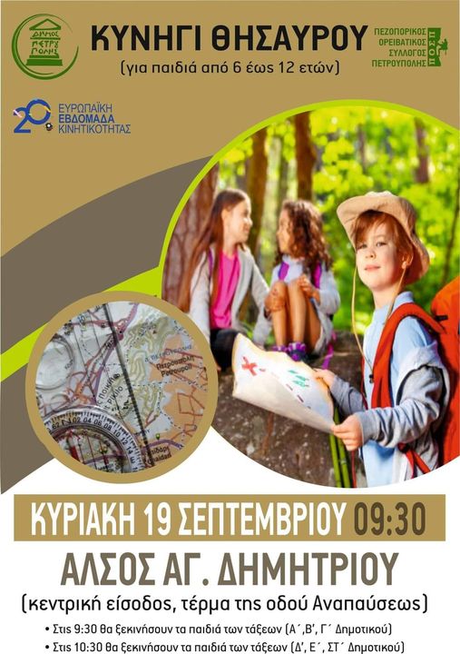 Ο Πεζοπορικό Ορειβατικό Σύλλογο Πετρούπολης σε συνεργασία με τον Δήμο Πετρούπολης διοργανώνει κυνήγι θησαυρού για παιδιά στο Άλσος Αγ. Δημητρίου την Κυριακή 19 Σεπτεμβρίου. Στα πλαίσια των δράσεων για την Ευρωπαϊκή Εβδομάδα Κινητικότητας 2020 (που πραγματοποιείται από τις 16 έως τις 22 Σεπτεμβρίου). Τα παιδιά θα έρθουν σε επαφή με το άλσος θα γνωρίσουν βασικές αρχές προσανατολισμού με πυξίδες και χάρτες μέσα από το παιχνίδι, θα είναι μία διαφορετική εμπειρία. Αφορά ηλικίες από 5 ετών μέχρι 10 ετών. Στις 9:30 θα ξεκινήσουν τα παιδιά (Α΄,Β΄, Γ΄ Δημοτικού) και στις 10:30 (Δ΄, Ε΄, Στ΄ Δημοτικού) στο πάνω μέρος του Άλσους στην παιδική χαρά.