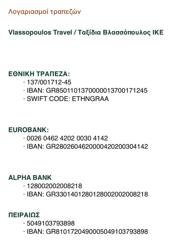 2. Για τις επόμενες δόσεις η πληρωμή μπορεί να γίνει απευθείας στους λογαριασμούς του Τουριστικού Πρακτορείου VlassopoulosTravel.